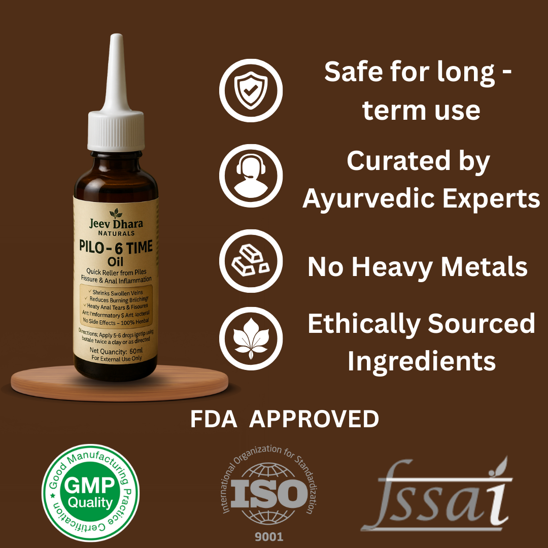 No more pain discomfort with Ayurvedic PILO -6 TIME OIL, which is backed by the FDA. Curated by Ayurvedic experts using 12 ethically sourced ingredients such as Nagkesar, Triphala Guggul, Mahaneem and Haritaki to alleviate symptoms of piles. As a piles OIL, it also addresses the root cause of piles, promoting overall well being. This piles treatment OIL has no presence of mercury, making it safe for long-time usage. So, keep in a cool, dry place away from sunlight to maintain potency.